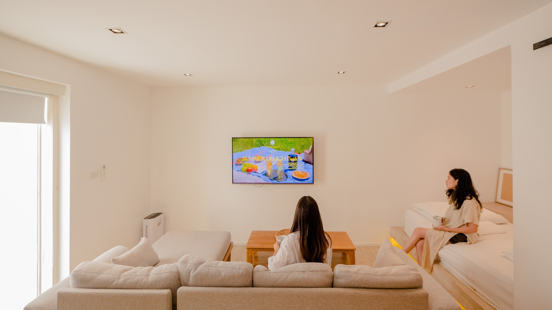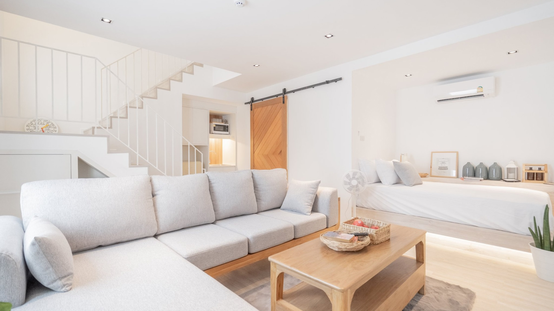There is a large sofa in the middle of the room with a 3.5-foot bed for 1 person.